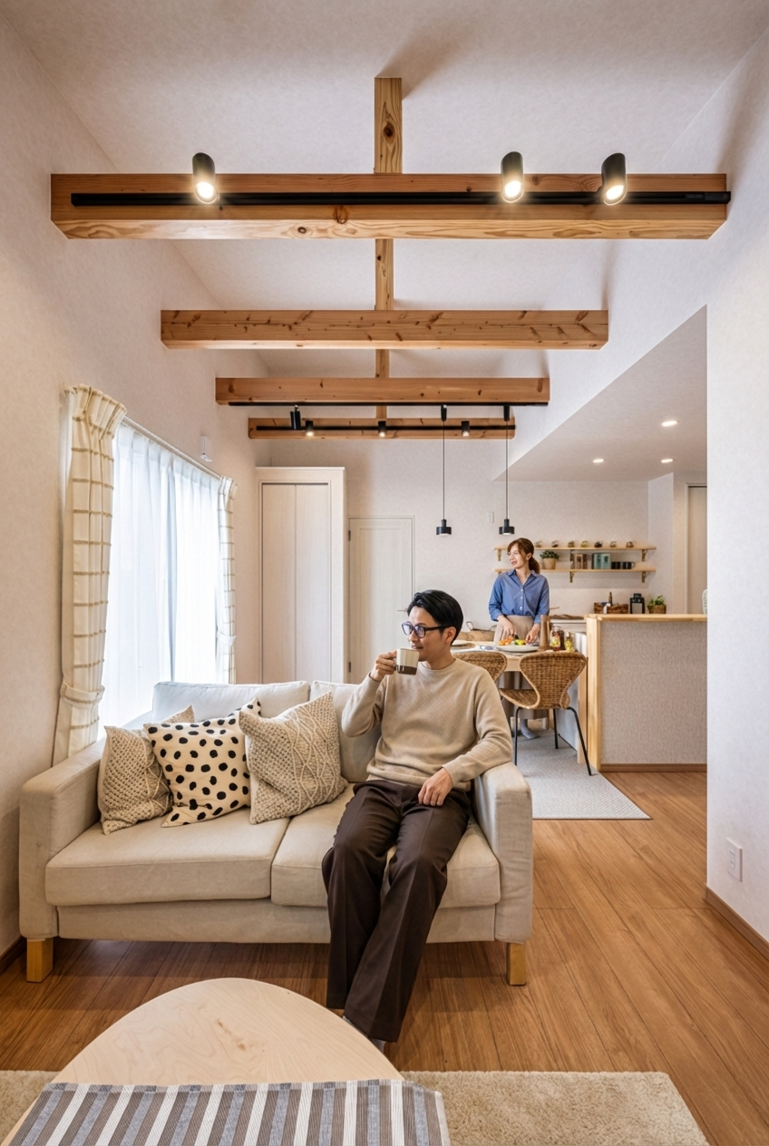 梁あらわしの勾配天井のリビングはとても開放的な空間です。